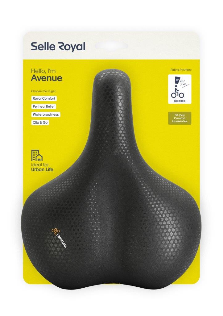 Selle Royal Avenue Relaxed zadel. Het Avenue zadel heeft moderne zwarte tinten en een Integrated Clip System voor het bevestigen van lampen en tasjes aan het zadel. De Royalgel biedt optimaal comfort en verminderd drukpunten met 40% ten opzichte van standaard zadelvullingen