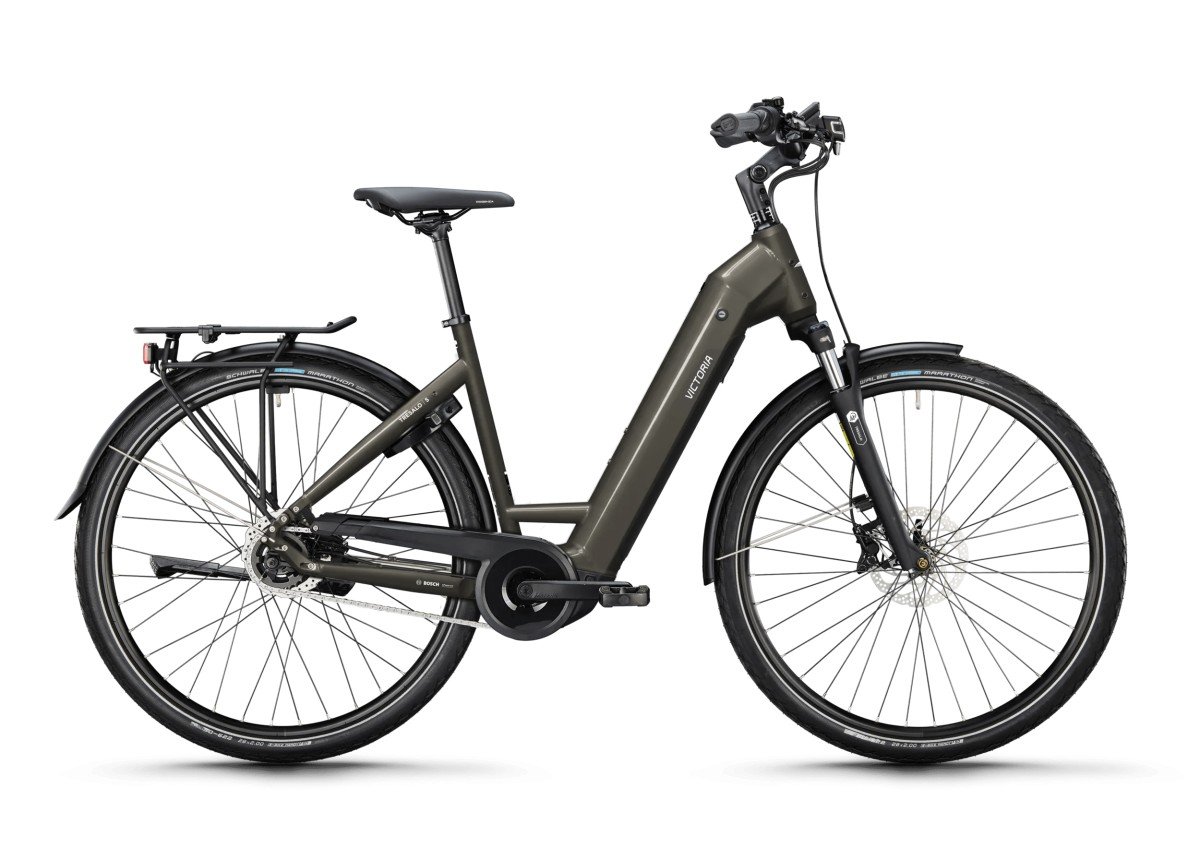VICTORIA Elektrische trekkingfiets “TRESALO 5″ (#2), 28”, slate grey ¦ All-road e-bike voor dagelijks gebruik. De TRESALO 5 van VICTORIA is de ideale allrounder voor dagelijks gebruik, in de stad of op het platteland. Uitgerust met StVZO-conforme LED-verlichting en Schwalbe anti-lekbanden biedt hij veiligheid en duurzaamheid op al je routes. De bagagedrager van MIK maakt het gemakkelijk om tassen en manden te monteren en zorgt voor flexibiliteit in het dagelijks leven. Comfort en praktisch De verende voorvork van Suntour zorgt voor een comfortabele rit, zelfs op oneffen wegen. De verstelbare stuurpen en het offset stuur zorgen voor een ergonomische zithouding die zich aanpast aan jouw rijstijl. De stijve zadelpen zorgt voor een directe krachtoverbrenging, wat vooral voordelig is bij woon-werkverkeer. De HTM-interface op het balhoofdstel biedt de mogelijkheid om verschillende bagagedragers uit het Victoria accessoireprogramma te bevestigen, waardoor het nog gemakkelijker wordt om kleinere spullen mee te nemen. Technische gegevens De TRESALO 5 is uitgerust met een betrouwbare Nexus naafversnelling met 5 versnellingen en Shimano schijfremmen voor en achter – voor veilig remmen in alle weersomstandigheden. De Bosch Performance aandrijving in combinatie met de PowerTube 540 accu zorgen voor een krachtige ondersteuning tijdens al je tochten. Het Purion 200 display toont je alle belangrijke informatie in een oogopslag. Alle bagagedragers hebben een tweede, onderste dwarsbalk waaraan fietstassen kunnen worden bevestigd. Doelgroep De TRESALO 5 is je trouwe dagelijkse metgezel als je op zoek bent naar een tijdloze, comfortabele e-bike die functionaliteit en rijplezier combineert. Ideaal voor alledaagse en occasionele fietsers die waarde hechten aan kwaliteit en waar voor hun geld.